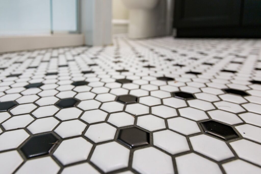 This smaller bathroom remodel achieves a stylish and timeless look with white and black 1×1 hexagon mosaic tiles on the floor, adding a vintage charm. The walls are adorned with sleek Camden White 4×12 tiles, creating a clean and bright atmosphere. These elements maximize the space while delivering a perfect blend of classic and modern design.