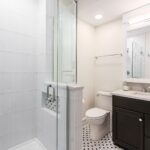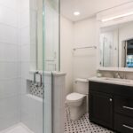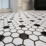 This smaller bathroom remodel achieves a stylish and timeless look with white and black 1×1 hexagon mosaic tiles on the floor, adding a vintage charm. The walls are adorned with sleek Camden White 4×12 tiles, creating a clean and bright atmosphere. These elements maximize the space while delivering a perfect blend of classic and modern design.