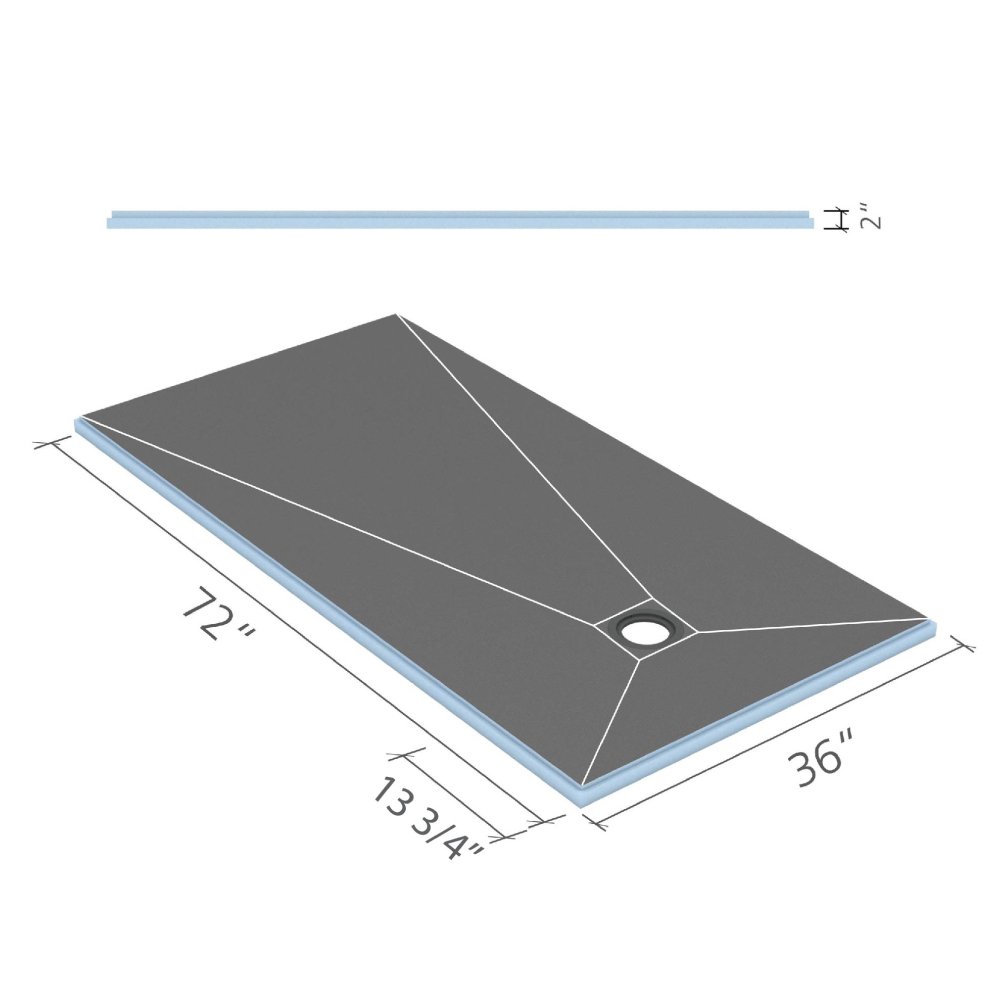 You will need to select a shower base that covers 2x the length of the longest dimensions along each axis. This will ensure that the shower base will cover the entire shower area and, if needed, can be trimmed on site to position the integrated wedi drain over the 2-inch wastepipe in the subfloor.