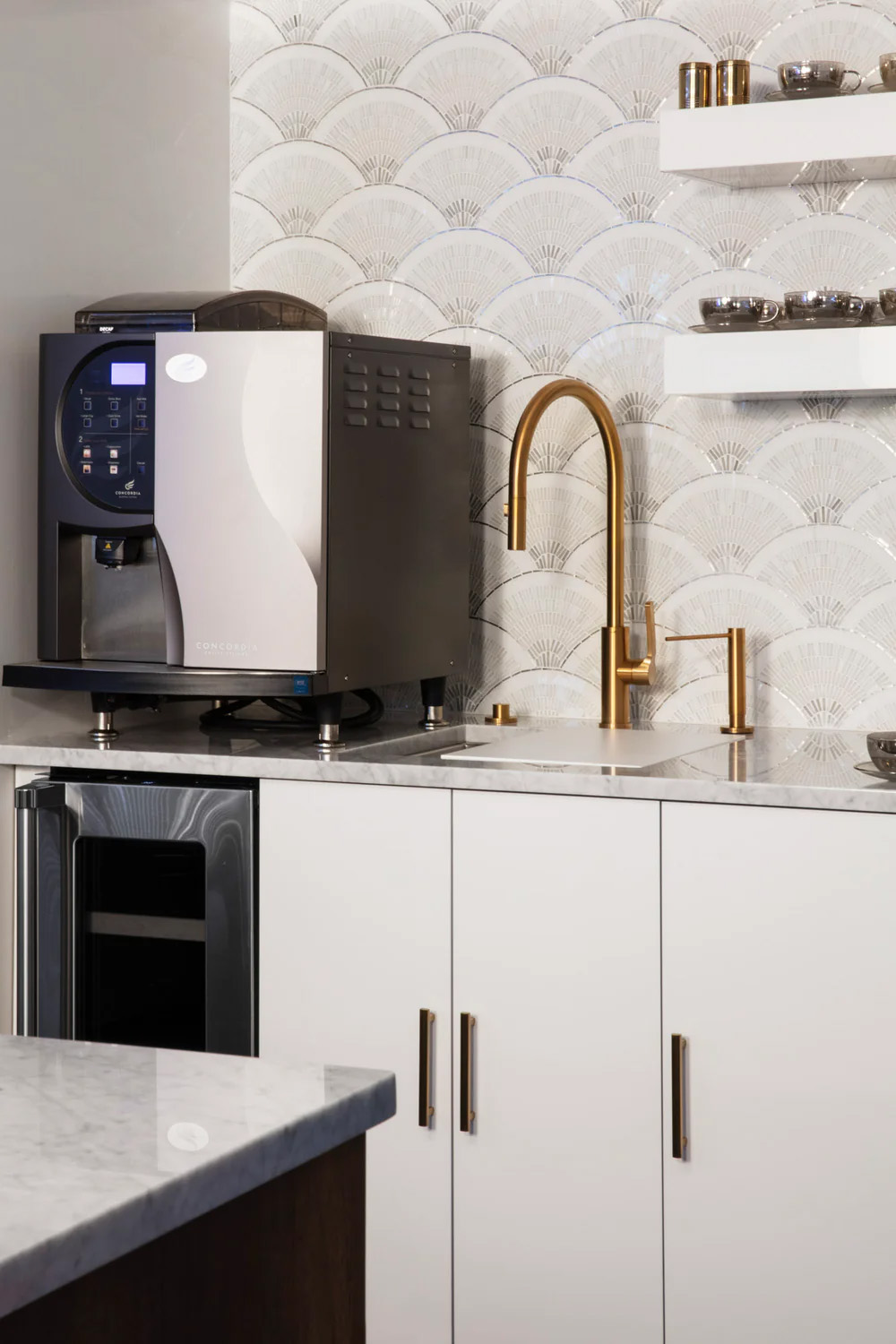 Fan Club takes a pattern from antiquity and forges it from dazzling Jazz Glass, adding an artistic Glass mosaic flair to a familiar motif. Colors available in solid Ice White, Blue Ombre with brushed Brass, Cream Ombre with brushed Brass, and White Ombre With Stainless Steel. The pattern in each colorway is truly special - tasteful, timeless, and thoroughly unique.