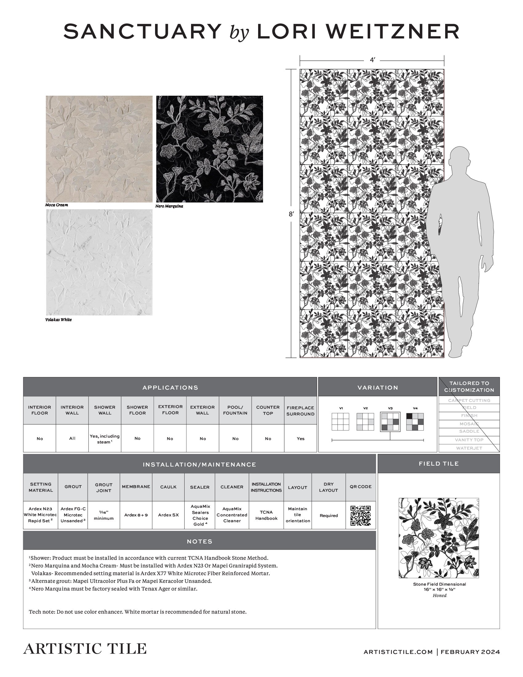 With Sanctuary Lori Weitzner makes another foray into stone, translating the fantastical land and sea motifs of her Neptune embroidered fabric into intricately carved and laser-etched dimensional marble, limestone, and dolomite. Sanctuary is offered in three contrasting colorways — Nero, Moca Cream, and Volakas. The pattern's leaves and flowers resonate from each stone, transporting the viewer to an exotic space where texture and pattern harmonize. Offered in 16" x 16" x 1/2" Moca Cream limestone and Volakas dolomite, and 16" x 16" x 3/8" Nero marble, all with a soft, honed and carved dimensional finish.