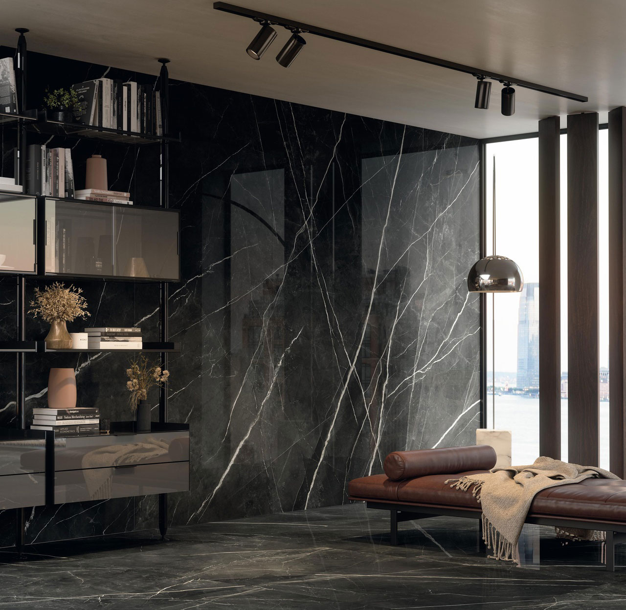 What makes Calacatta Black special is its intensely dark background riven by lighter shades. Like the original marble, the white veins emphasize the partitions between the shades.