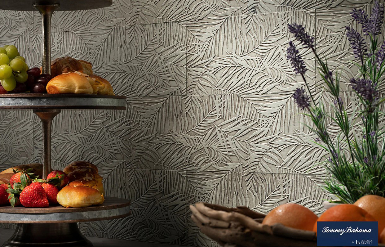 Lunada Bay Tile is thrilled to expand its partnership with Tommy Bahama in creating Kapa, a captivating collection of hand-crafted concrete tiles. Reinterpreting Tommy Bahama's most iconic textile prints into dimensional tile surfaces, Kapa concrete tiles are inspired by elements of the exotic: sumptuous tropical fabrics, lush palm fronds, and waves lapping along a quiet shoreline. The dimensional surfaces add subtle, luxe texture to walls and coordinate with Tommy Bahama Glass Blends and other Lunada Bay Tile glass collections.